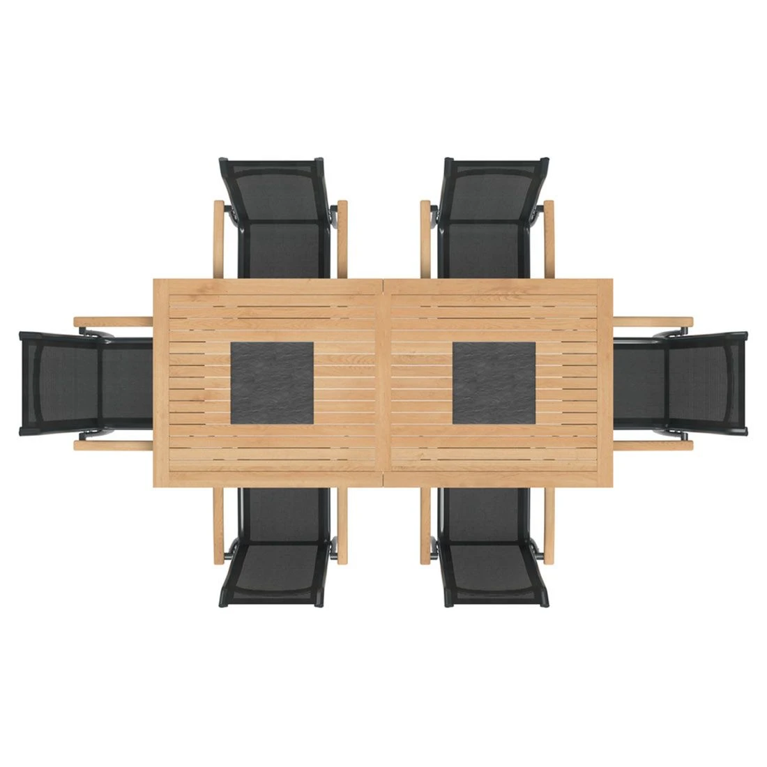 Im Preis des Sets ist ein passender Tisch enthalten. Teakholz ist außergewöhnlich widerstandsfähig gegen Witterungseinflüsse wie Schwankungen in der Temperatur, Nässe und Trockenheit. Kein Wunder, dass dieses hochwertige Holz als Material für die Tischplatte verwendet wird. Die Form des Tisches ist klassisch rechteckig gestaltet.
