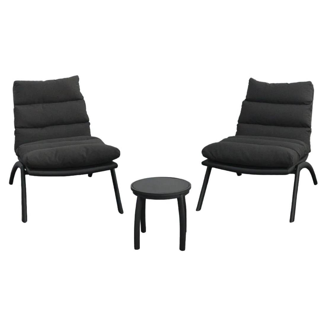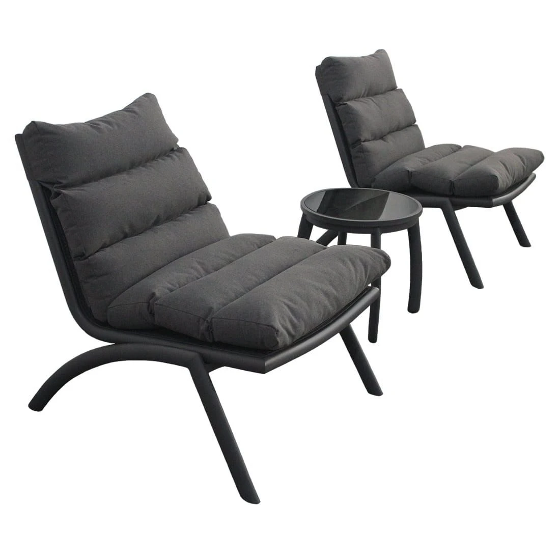 Die robusten Metallgestelle aus Aluminium sind pflegeleicht und garantieren gleichzeitig eine hohe Stabilität. Darüber hinaus gewährleistet dieses leichte Material, dass Sie die Möbel bequem transportieren können. Optisch ansprechend ist die Farbgebung der Gestelle in Anthrazit. Ein weiterer Pluspunkt ist die Bespannung der Sitzflächen mit Textilene. Dieses Material zeichnet sich durch eine hohe Robustheit gegenüber Hitze und Frost aus und ist leicht zu reinigen. Farblich begeistern die Bezüge in elegantem Grau. Der im Set enthaltene Tisch begeistert mit einer Tischplatte aus robustem Glas. Farblich überzeugt die Tischplatte in Schwarz.