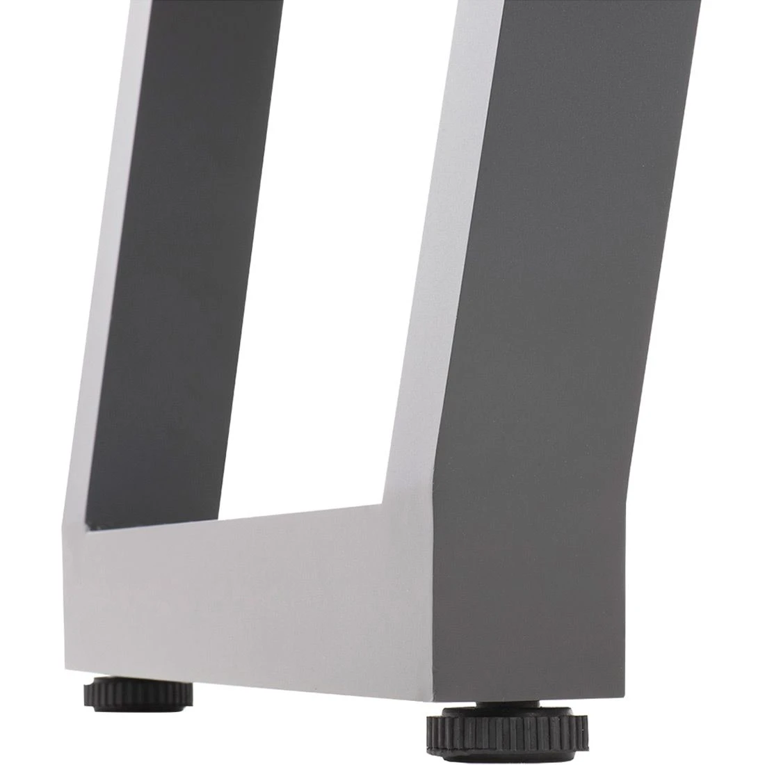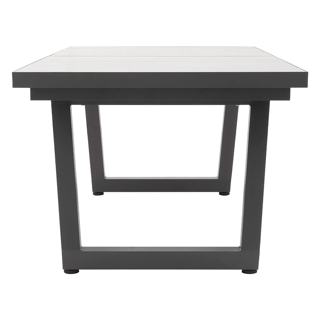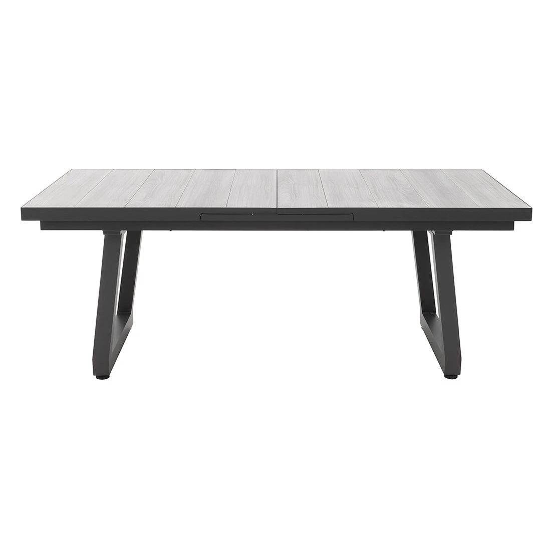 Das Gestell des leichten Tisches ist aus Aluminium gefertigt. Der moderne Look des Ausziehtisches wird durch die attraktiven Kufen nochmals betont. Keramik ist das Material, das für die Tischplatte gewählt wird. Das robuste Material ist nicht so schwergewichtig wie Naturstein, sorgt allerdings ebenso für windsicheren Halt auf der Terrasse. Farblich ist die Tischplatte in einem schönen Holzoptik-Grau gehalten. Die Form des Ausziehtisches ist klassisch rechteckig gestaltet.