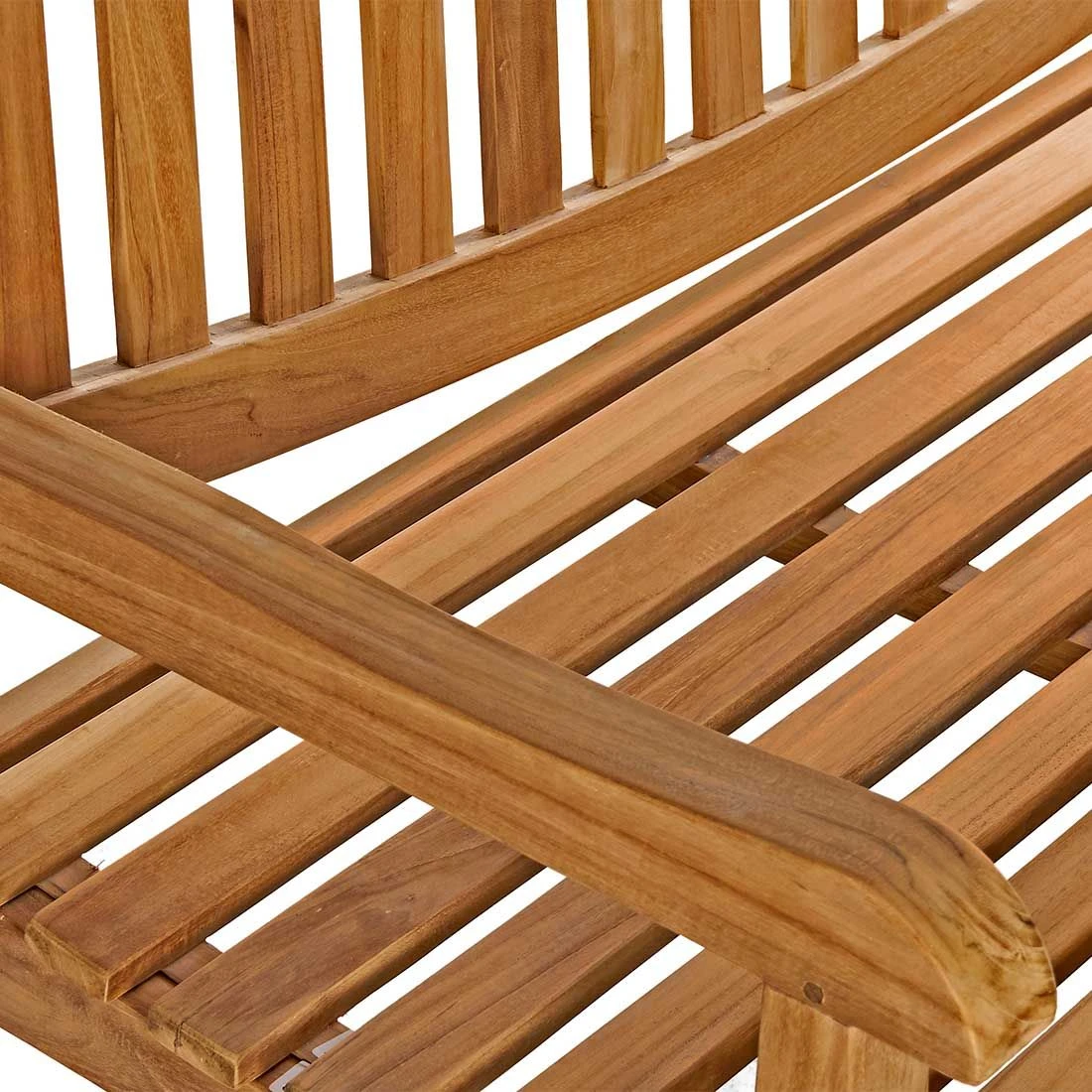 Die Gartenbank besteht vollständig aus Teakholz. Dies erzeugt nicht nur ein geschmackvolles, sondern auch einheitliches Bild des attraktiven Möbels. Für ein perfekt stimmiges Gesamtbild sorgt die einheitliche Farbgebung in stilvollem Natur.