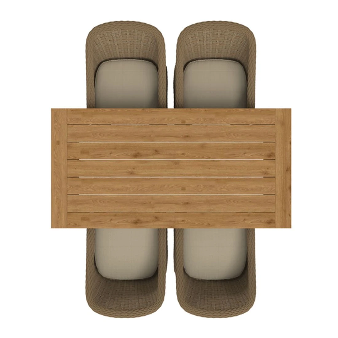 Zum Lieferumfang des Sets gehört auch ein praktischer Tisch. Die Gebrauchsspuren in der Tischplatte sind Teil der Formensprache der Tischplatte. Denn diese ist aus wiederverwertetem Teak gearbeitet, das zuvor aus alten Hütten und Booten gewonnen wurde. Bei der Aufarbeitung werden dann Einkerbungen, Nagellöcher und Co. bewusst erhalten. Jede Tischplatte und damit jeder Gartentisch ist also ein Unikat. Die rechteckige Form ermöglicht es Ihnen, den Tisch in Ecken und an Häuserwänden platzsparend einzusetzen.