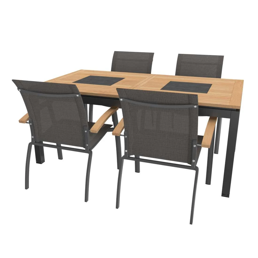 Im Set enthalten ist auch ein passender Tisch. Die Tischplatte ist aus qualitativ hochwertigem Teak gefertigt. Mit ihrem hohen natürlichen Anteil an Öl, ist sie damit einwandfrei vor Witterungseinflüssen geschützt. Mit der rechteckigen Form lässt sich der Tisch platzsparend in Ecken oder an Häuserwänden aufstellen.