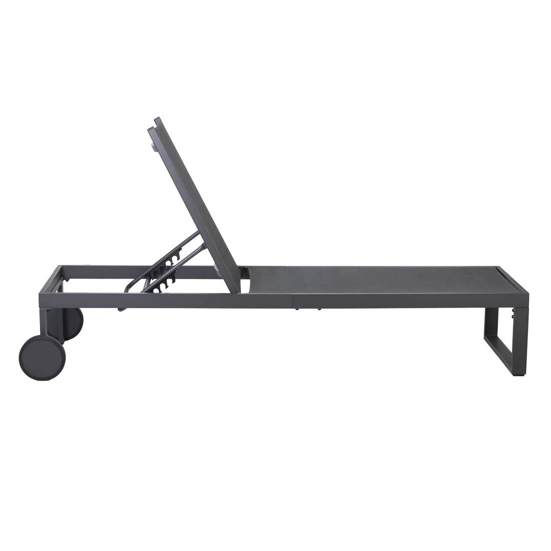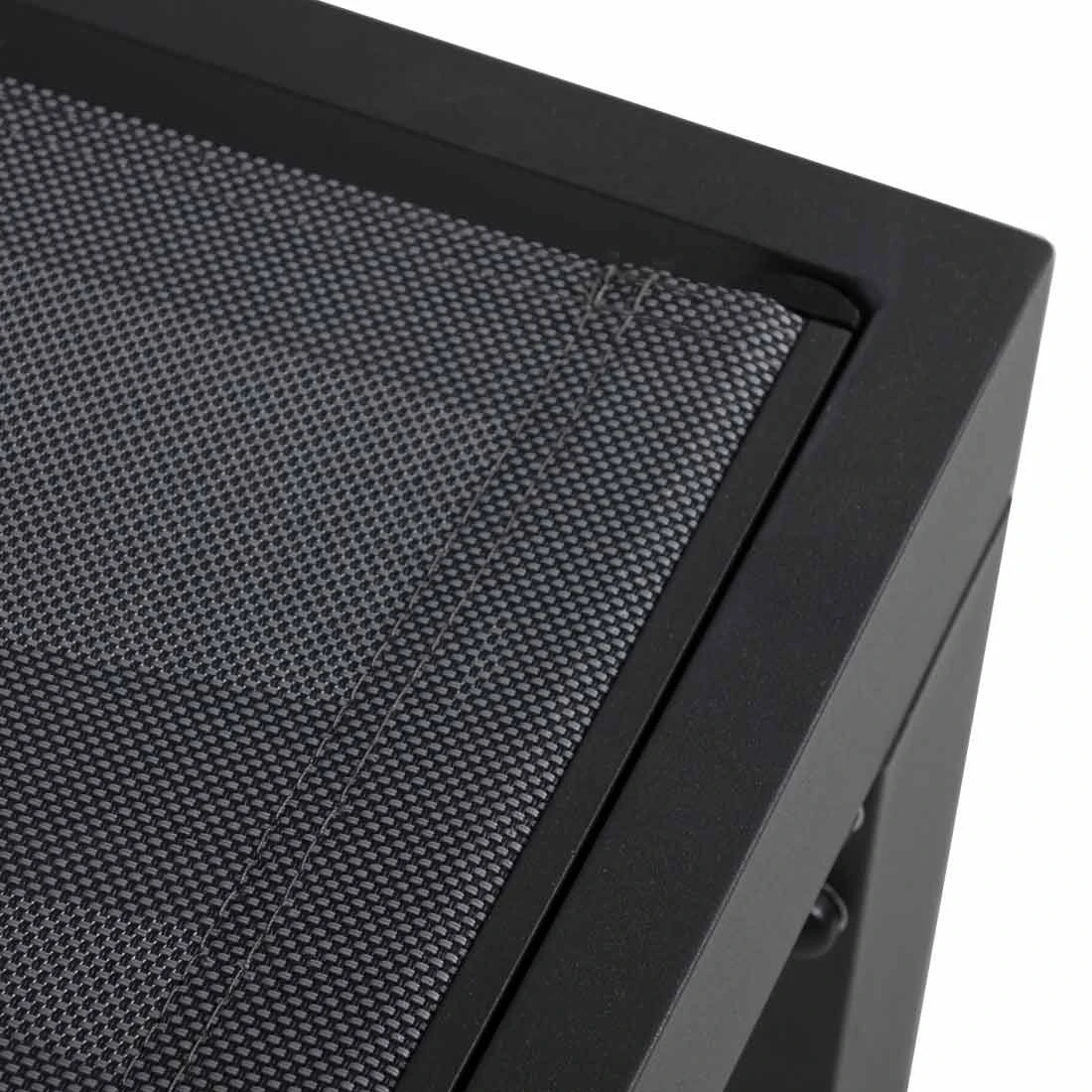 Das Gestell besteht aus pflegeleichtem und wetterfestem Aluminium. Für die Bespannung der Sitzfläche wird hochwertiges Textilene verwendet. Es zeichnet sich durch eine hohe Robustheit gegenüber Hitze und Frost aus und ist leicht zu reinigen. Für ein perfekt stimmiges Gesamtbild sorgt die einheitliche Farbgebung in stilvollem Anthrazit.