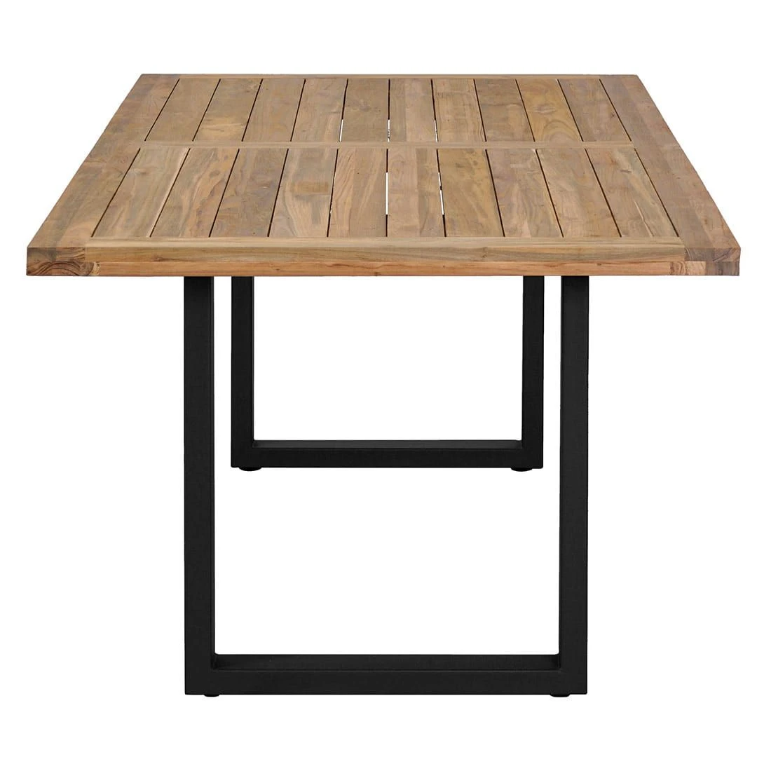 Im Setangebot enthalten ist auch ein passender Tisch. Die Tischplatte wird aus recyceltem, also wiederverwertetem, Teak gefertigt. Hier werden bewusst alte Gebrauchsspuren wie Kerben oder Nagellöcher erhalten, so dass jeder Tisch ein wahres Unikat ist. Das Gestell besticht mit seinen attraktiven Kufen. Die Form des Tisches ist klassisch rechteckig gehalten.