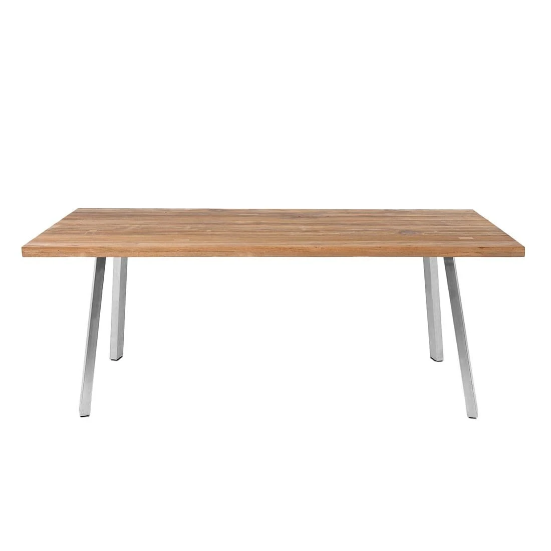 Als Gestellmaterial wird qualitativ hochwertiger und rostfreier Edelstahl verwendet. Das klassische Vierfuß-Gestell garantiert Ihnen maximale Beinfreiheit. Die Gebrauchsspuren in der Tischplatte sind Teil der Formensprache. Denn die Tischplatte ist aus wiederverwertetem Teak hergestellt worden, das zuvor aus alten Hütten und Booten gewonnen wurden. Bei der Aufarbeitung werden dann Einkerbungen, Nagel- und Schraublöcher bewusst erhalten. Jede Tischplatte und damit jeder Gartentisch ist also ein echtes Unikat. Farblich ist die Tischplatte in einem schönen Teak Recycelt gehalten. Das Design des Gartentisches ist klassisch rechteckig gehalten.