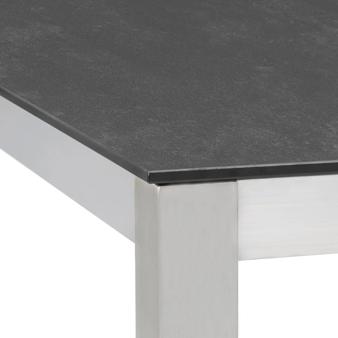 Das Gestell ist aus rostfreiem und pflegeleichtem Edelstahl gefertigt und äußerst windsicher auf der Terrasse. Für die Herstellung der Tischplatte wird robustes Glas verwendet. Für ein stimmiges Gesamtbild erscheint die Platte in der Farbe Dunkelgrau.
