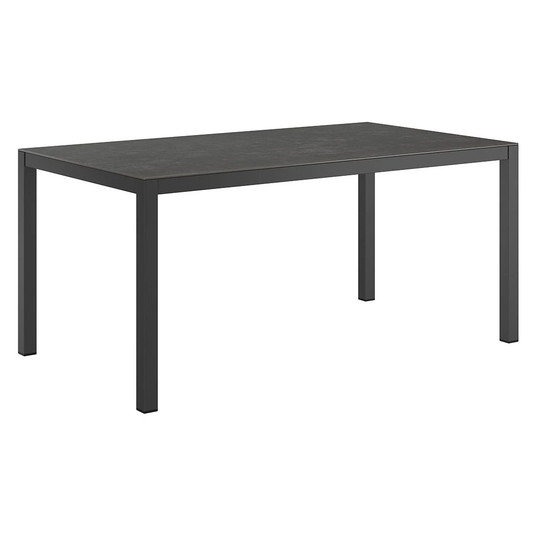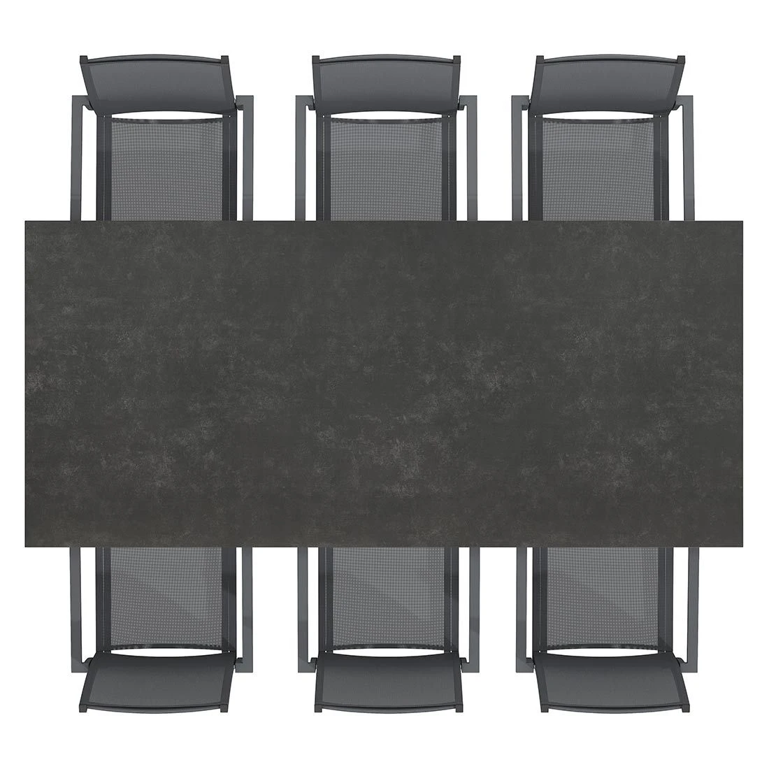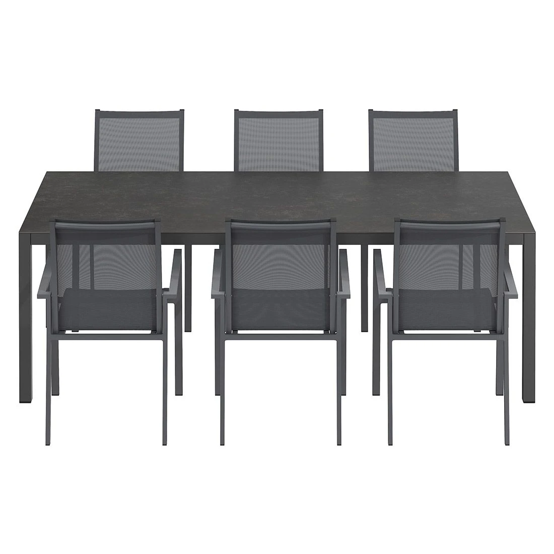 Damit das Gartenmöbel-Set optisch ansprechend ist, sind das Gestell und die Sitzfläche im Farbton Anthrazit gehalten. Das Gestell ist aus Aluminium gefertigt. Dadurch lassen sich die Möbel leicht von einem Standort zum nächsten transportieren und sind dennoch sehr stabil. Ein weiterer Pluspunkt ist die Bespannung der Sitzflächen mit Textilene. Dieses Material zeichnet sich durch eine hohe Robustheit gegenüber Hitze und Frost aus und ist leicht zu reinigen. Der im Set enthaltene Tisch begeistert mit einer Tischplatte aus robustem Glas. Farblich überzeugt die Tischplatte in Dunkelgrau. Als klassische Design-Komponente fungiert das geradlinige Vierfußgestell. Das Design des Tisches ist klassisch rechteckig gestaltet.