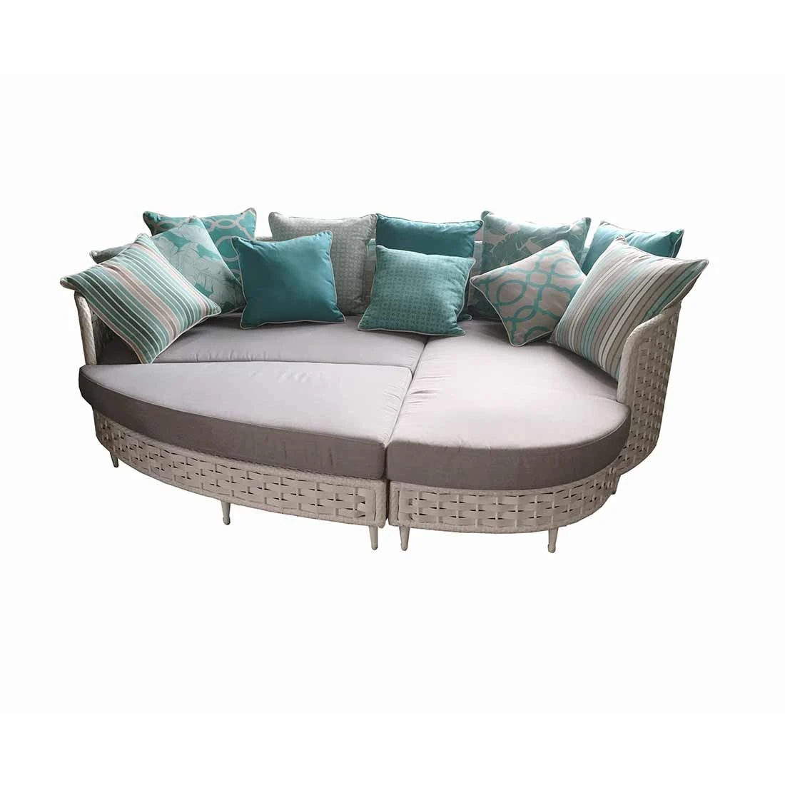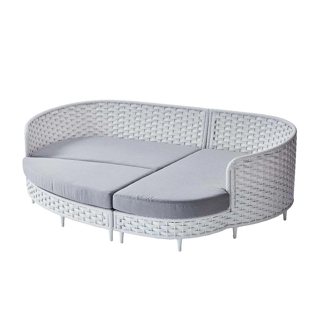 Damit die Sonneninsel optisch ansprechend ist, sind das Gestell und die Sitzfläche im Farbton Weiß gehalten. Das Gestell ist aus Aluminium hergestellt. Das Gestell, das mit hochwertigem Polyrattan umflochten ist, bringt ein natürliches Ambiente auf Ihre Terrasse. Dieses Material zeichnet sich durch eine hohe Wetterbeständigkeit aus. Die Sitzfläche ist angenehm gepolstert. Die Farbe des Bezugs ist Grau. Die Tischplatte ist Hellgrau.