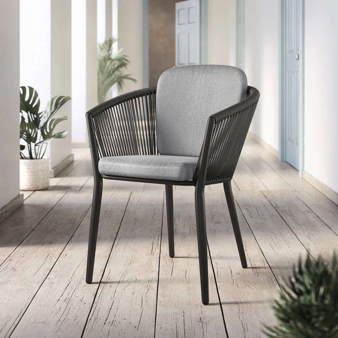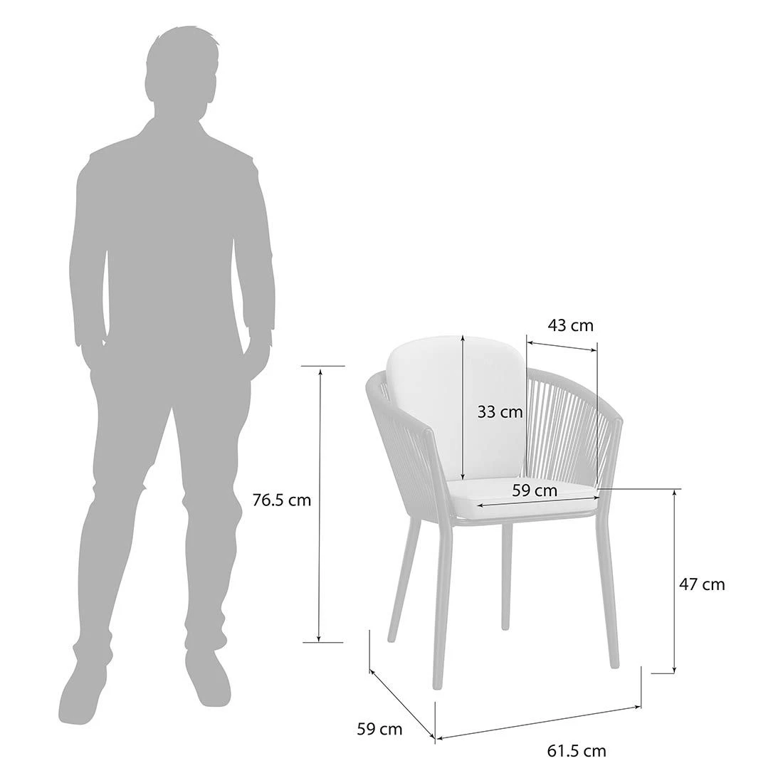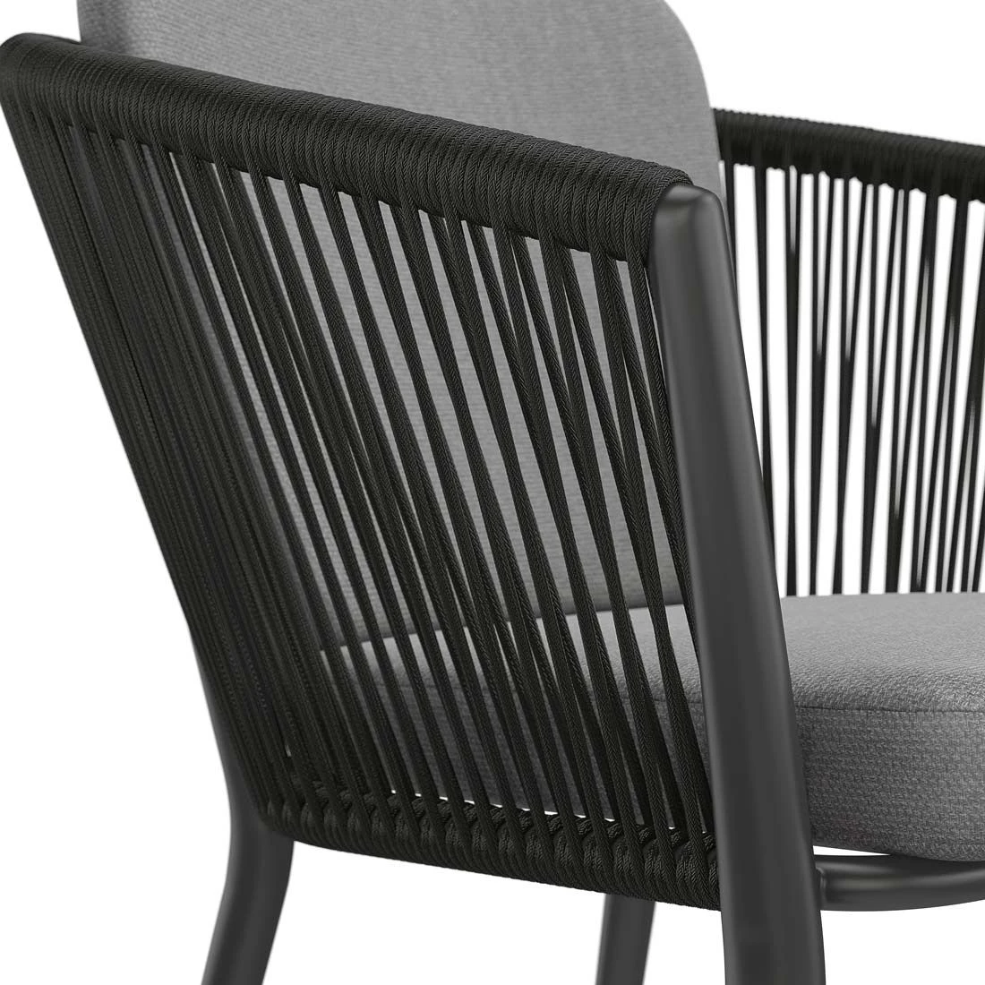 Das Gestell besteht aus pflegeleichtem und wetterfestem Aluminium. Hochwertiges Rope umgibt das robuste Gestell und verleiht dem Gartensessel damit einen ganz besonderen Look. Für die Bezüge wird Olefin verwendet. Der Marken-Outdoorstoff überzeugt mit einer hohen Witterungsbeständigkeit. Denn sowohl Sonne als auch Regen können dem robusten Outdoor-Stoff kaum etwas anhaben. Farblich begeistert der Bezug in elegantem Dunkelgrau. Damit der Gartensessel optisch ansprechend ist, sind das Gestell und der Korpus im Farbton Schwarz gehalten.