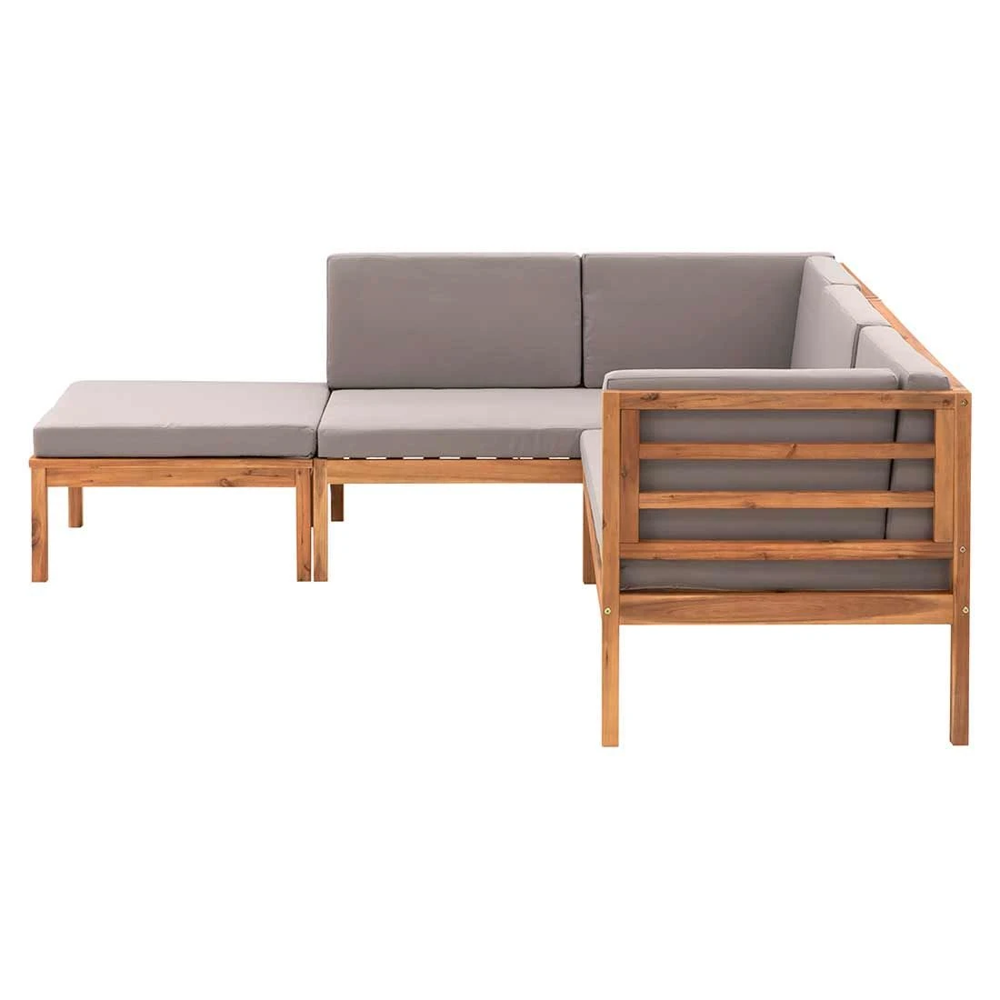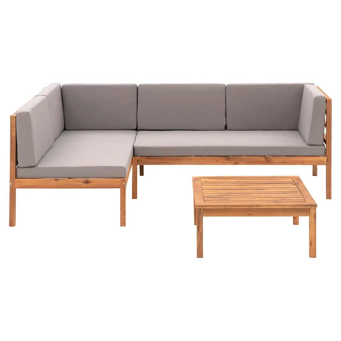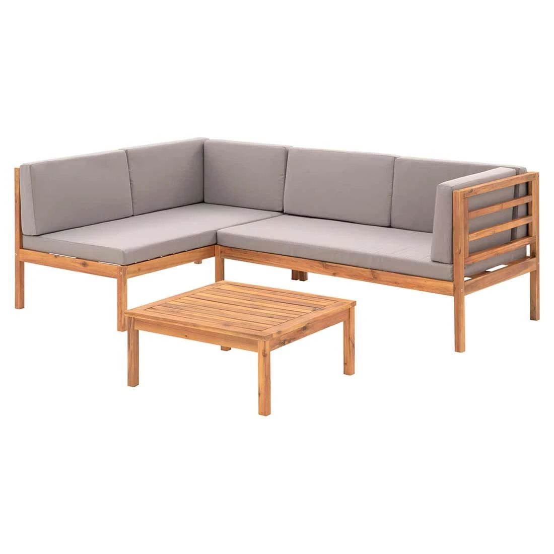 Für die Sitzfläche und den Bezug kommt Polyester zum Einsatz. Das Gestell und die Tischplatte sind hingegen aus Akazienholz gefertigt. Damit die Ecklounge optisch ansprechend ist, sind die Sitzfläche und der Bezug im Farbton Hellgrau gehalten. Das Gestell und die Tischplatte begeistern hingegen in Akazie.