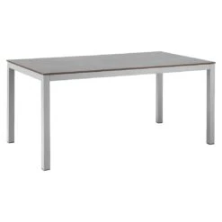 Damit das Gartenmöbel-Set optisch ansprechend ist, sind das Gestell und die Sitzfläche im Farbton Anthrazit gehalten. Die robusten Metallgestelle aus Aluminium sind pflegeleicht und garantieren gleichzeitig eine hohe Stabilität. Darüber hinaus gewährleistet dieses leichte Material, dass Sie die Möbel bequem transportieren können. Die attraktive Rope-Bespannung, die die Gestelle umgibt, rundet das Gesamtbild stilvoll ab. Farblich begeistern die Bezüge in elegantem Hellgrau. Im Setangebot enthalten ist auch ein passender Tisch. Die Tischplatte wird aus recyceltem, also wiederverwertetem, Teakholz gefertigt. Hier werden bewusst alte Gebrauchsspuren wie Kerben oder Nagellöcher erhalten, so dass jeder Gartentisch ein wahres Unikat ist. Passend zum Gesamtbild des Gartenmöbel-Sets begeistert die Tischplatte mit ihrer Farbgebung in Natur. Als klassische Design-Komponente fungiert das geradlinige Vierfußgestell. Der Tisch ist klassisch rechteckig gestaltet.