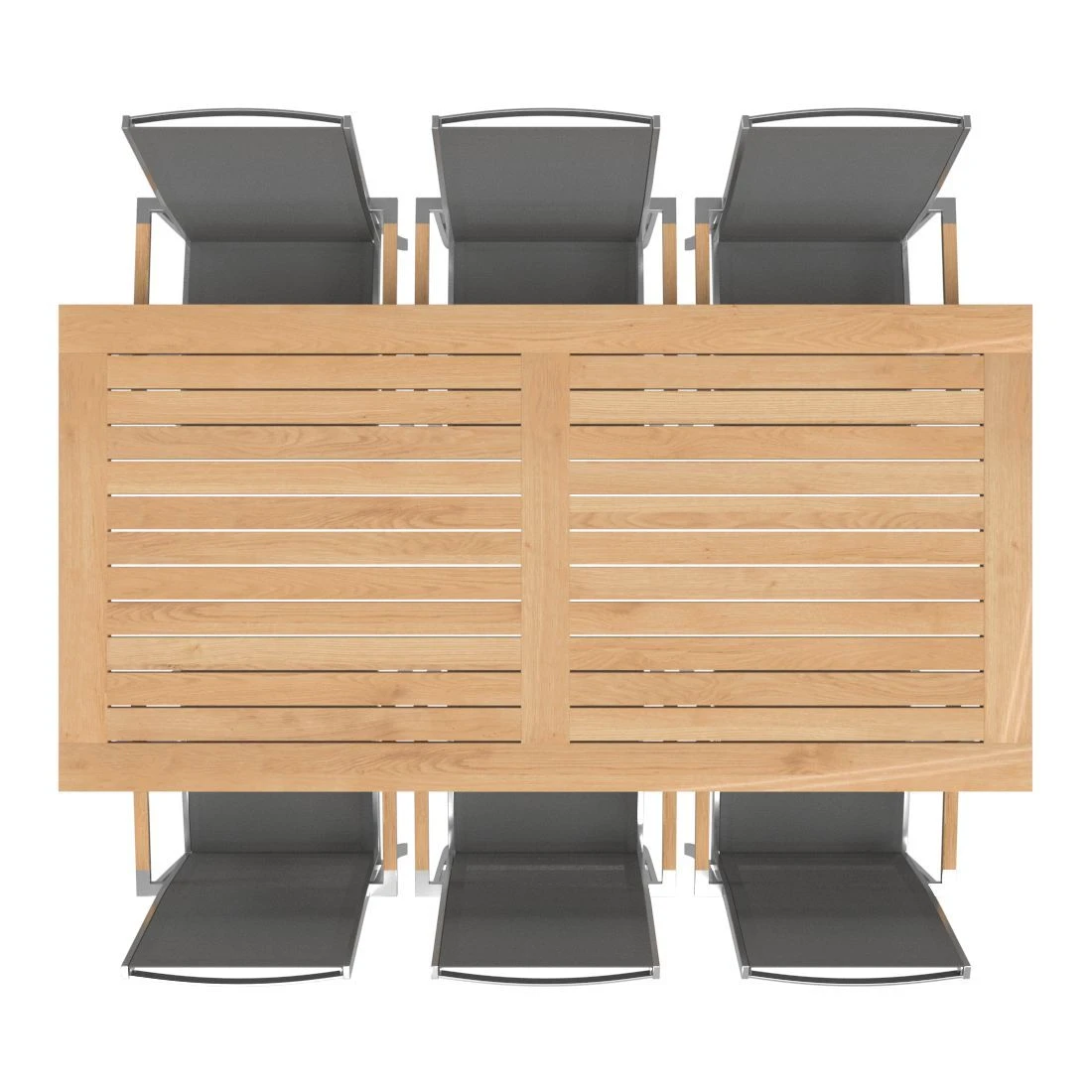 Zum Lieferumfang des Sets gehört auch ein passender Tisch. Als Material für die Tischplatte wird das besonders hochwertige Hartholz Teak gewählt. Die Maserung dieses Holzes und der warme Farbton integrieren sich äußerst gut in das Gesamtbild eines jeden Gartens und verbreiten eine einzigartige natürliche Atmosphäre. Mit der rechteckigen Form lässt sich der Tisch platzsparend in Ecken oder an Häuserwänden aufstellen.