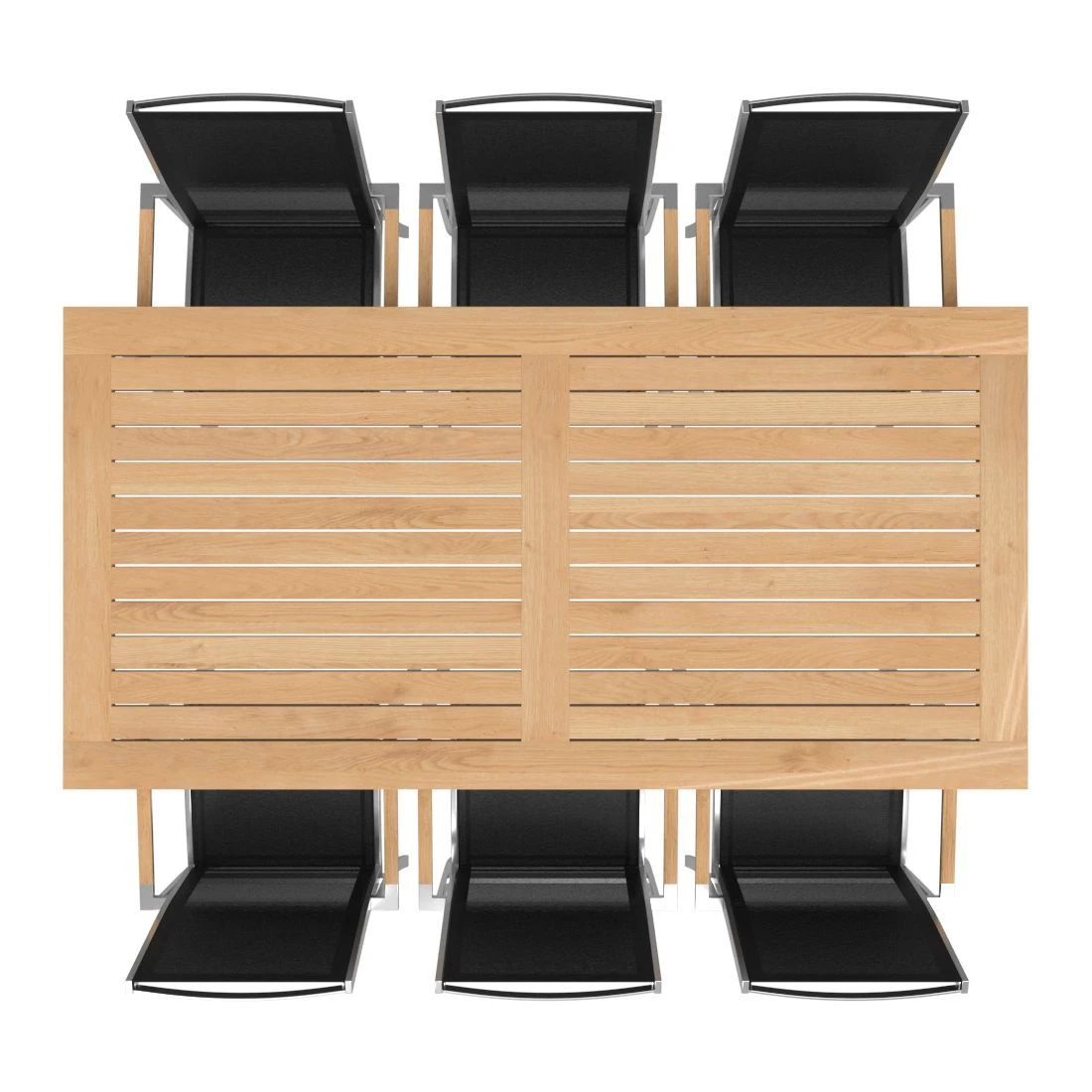 Im Preis des Sets ist ein passender Tisch enthalten. Teakholz ist außergewöhnlich widerstandsfähig gegen Witterungseinflüsse wie Temperaturschwankungen, Nässe und Trockenheit. Kein Wunder, dass dieses hochwertige Holz als Material für die Tischplatte verwendet wird. Mit der rechteckigen Form lässt sich der Tisch platzsparend in Ecken oder an Häuserwänden aufstellen.