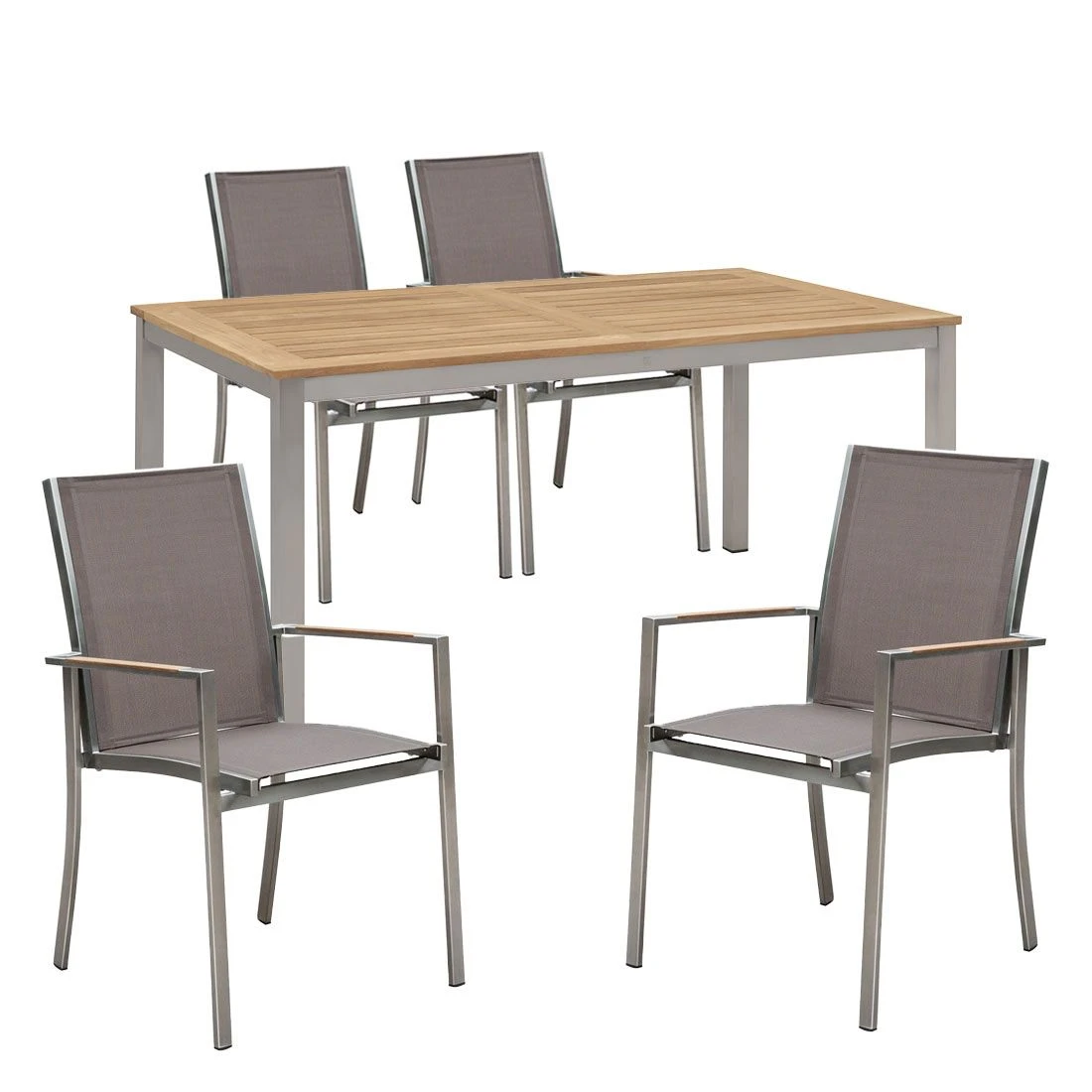 Zum Set gehört auch ein passender Tisch. Dessen Tischplatte ist aus Teakholz (Natur) gefertigt und rundet das stimmige Gesamtbild des Gartenmöbel-Sets ab. Zum Lieferumfang des Sets gehört auch ein passender Tisch. Als Material für die Tischplatte wird das wertvolle Hartholz Teak gewählt. Die Maserung dieses Holzes und der helle Farbton integrieren sich sehr gut in das Gesamtbild eines jeden Gartens und verbreiten eine einzigartige natürliche Atmosphäre. Die Form des Tisches ist klassisch rechteckig gehalten.