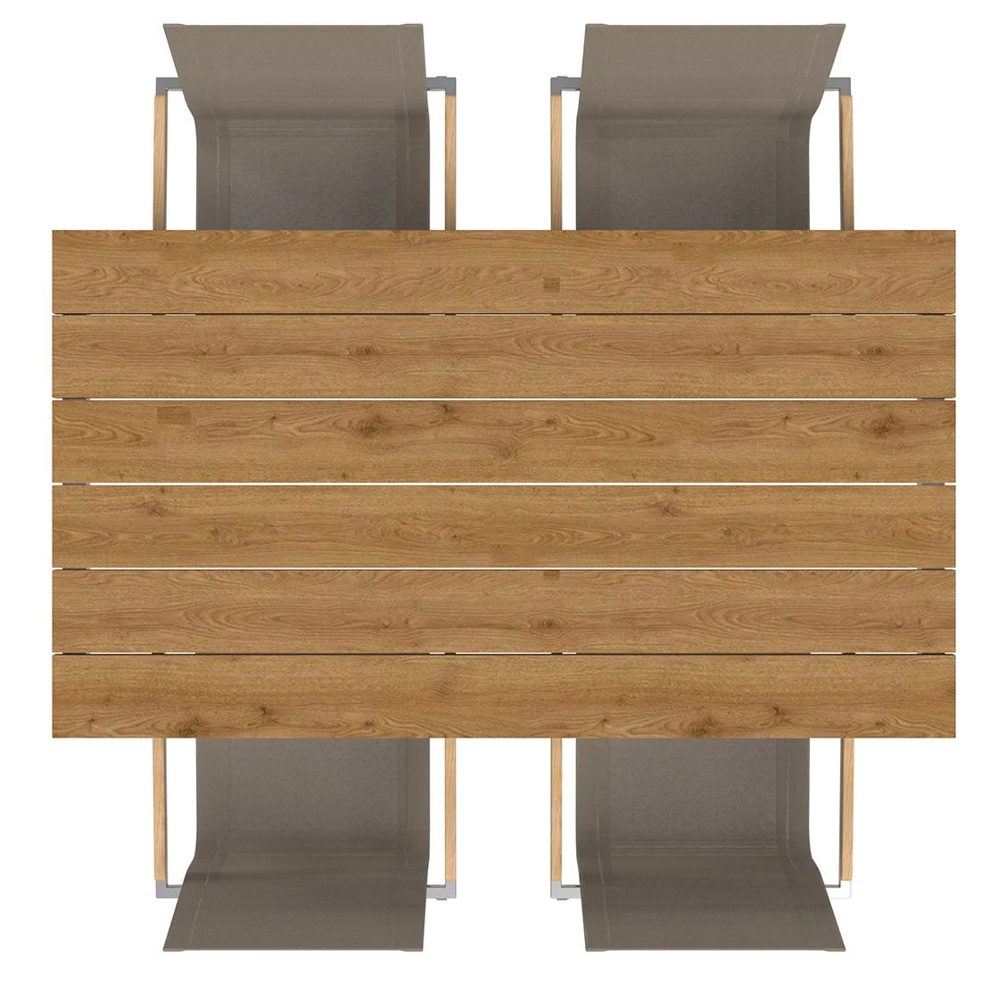 Die robusten Edelstahlgestelle sorgen für eine hohe Stabilität und Tragfähigkeit. Darüber hinaus begeistern diese mit einem zeitlos eleganten Look. Optisch ansprechend ist die Farbgebung der Gestelle in Silber. Ein weiterer Pluspunkt der Sitzmöbel ist die Bespannung der Sitzflächen mit Textilene in der Farbe Taupe. Dieses Material zeichnet sich durch eine hohe Robustheit gegenüber Hitze und Frost aus und ist leicht zu reinigen. Zum Lieferumfang des Sets gehört auch ein praktischer Tisch. Die Gebrauchsspuren in der Tischplatte sind Teil des Designs der Tischplatte. Denn diese ist aus wiederverwertetem Teak gearbeitet, das zuvor aus alten Hütten und Booten gewonnen wurde. Bei der Aufarbeitung werden dann Einkerbungen, Nagellöcher und Co. bewusst erhalten. Jede Tischplatte und damit jeder Gartentisch ist also ein Unikat. Die rechteckige Form ermöglicht es Ihnen, den Tisch in Ecken und an Häuserwänden platzsparend einzusetzen. Passend zum Gesamtbild des Gartenmöbel-Sets begeistert die Tischplatte mit ihrer Farbgebung in Teak Recycelt, während das Gestell in Silber gehalten ist.