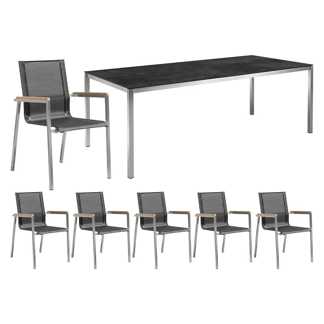 Die robusten Edelstahlgestelle sorgen für eine hohe Stabilität und Tragfähigkeit. Darüber hinaus begeistern diese mit einem zeitlos eleganten Look. Optisch ansprechend ist die Farbgebung der Gestelle in Silber. Ein weiteres Highlight der Sitzmöbel ist die Bespannung der Sitzflächen mit Textilene. Dieses Material zeichnet sich durch eine hohe Robustheit gegenüber Hitze und Frost aus und ist leicht zu reinigen. Im Lieferumfang des Sets ist auch ein passender Tisch enthalten. Für die Tischplatte wird als Material hochwertiges Keramik verwendet, das eine zeitlose Atmosphäre auf der Terrasse und im Garten schafft. Die rechteckige Form ermöglicht es Ihnen, den Tisch in Ecken und an Häuserwänden platzsparend einzusetzen. Als klassische Design-Komponente fungiert das geradlinige Vierfußgestell. Farblich ist das Gestell in Silber gehalten, die Tischplatte überzeugt in der Farbe Concrete Coal.