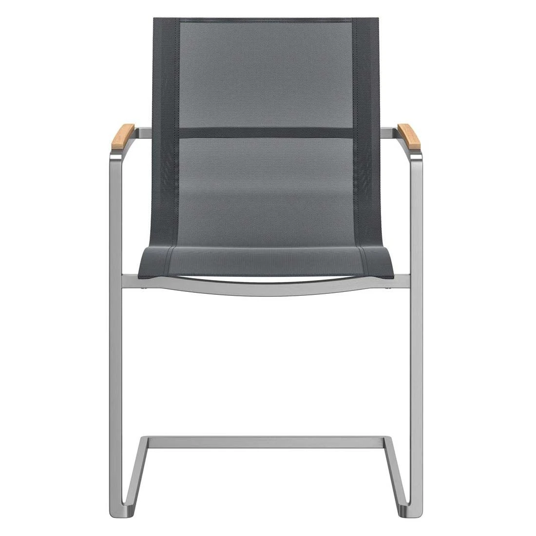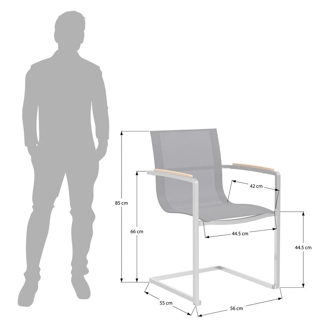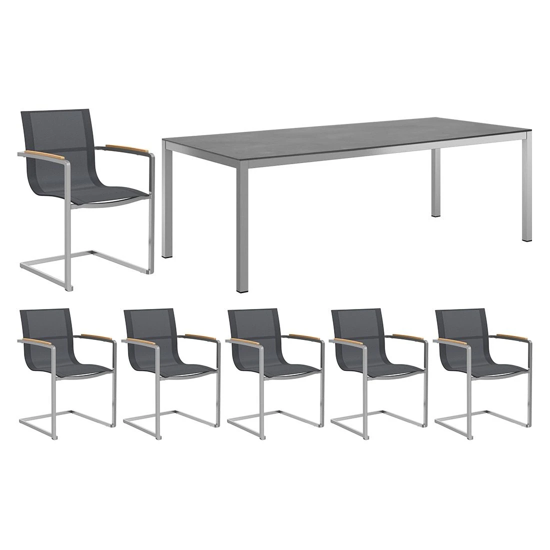 Die Gestelle sind aus Edelstahl gefertigt und sorgen somit für einen modernen Look und eine hohe Stabilität. Optisch ansprechend ist die Farbgebung der Gestelle in Silber. Ein weiterer Pluspunkt der Sitzmöbel ist die Bespannung der Sitzflächen mit Textilene in der Farbe Silber-Schwarz. Dieses Material zeichnet sich durch eine hohe Robustheit gegenüber Hitze und Frost aus und ist leicht zu reinigen. Im Set enthalten ist zudem ein Tisch. Die ansprechende HPL-Tischplatte ist nicht nur ein optischer Hingucker, sondern besitzt zudem eine sehr massive und durchaus kratzfeste Oberfläche, die jeglichen Belastungen entgegenwirkt. Die rechteckige Form ermöglicht es Ihnen, den Tisch in Ecken und an Häuserwänden platzsparend einzusetzen. Als klassische Design-Komponente fungiert das geradlinige Vierfußgestell. Farblich ist das Gestell in Silber gehalten, die Tischplatte überzeugt in der Farbe Zement Dunkel.