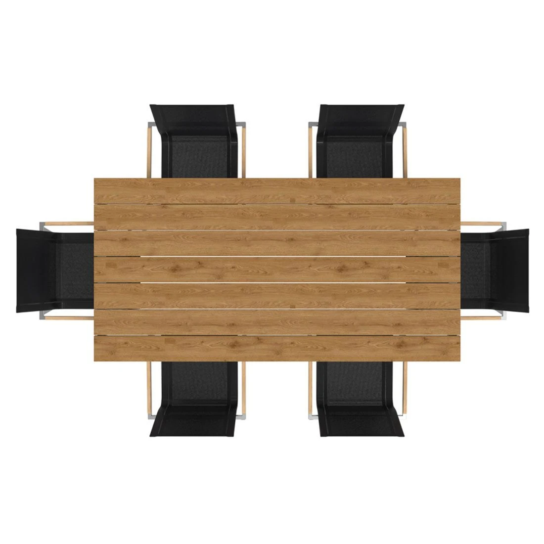 Die Gestelle sind aus Edelstahl gefertigt und sorgen somit für einen modernen Look und eine hohe Stabilität. Optisch ansprechend ist die Farbgebung der Gestelle in Silber. Ein der Sitzmöbel ist die Bespannung der Sitzflächen mit Textilene in der Farbe Schwarz. Dieses Material zeichnet sich durch eine hohe Robustheit gegenüber Hitze und Frost aus und ist leicht zu reinigen. Die Sitzflächen und die Bezüge sind einheitlich im Farbton Schwarz gehalten. Im Setangebot enthalten ist auch ein passender Tisch. Die Tischplatte wird aus recyceltem, also wiederverwertetem, Teakholz gefertigt. Hier werden bewusst alte Gebrauchsspuren wie Kerben oder Nagellöcher erhalten, so dass jeder Tisch ein wahres Unikat ist. Mit der rechteckigen Form lässt sich der Tisch platzsparend in Ecken oder an Häuserwänden aufstellen. Während die Farbe des Gestells Silber ist, begeistert die Tischplatte in Teak Recycelt.